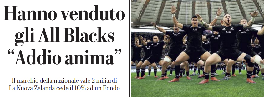 “L’haka non sarà mai in vendita”, giuravano. Bugiardi. Anche l’anima dei guerrieri maori ha un prezzo: 120 milioni di euro, tanto per cominciare. E altri 60 tra qualche mese, affare fatto. Il fondo californiano Silver Lake Partners si è assicurato il 10% dei diritti commerciali degli All Blacks, la mitica nazionale neozelandese di rugby. Sì, la squadra che veste di nero perché dicono porti il lutto dei propri avversari, destinati alla sconfitta: una leggenda sportiva che più o meno consapevolmente ha trasformato la sua storia – e la suggestiva danza eseguita prima di ogni partita, coi campioni che si battono il petto invocando lo spirito dei loro antenati – in un brand commerciale del valore vicino ai due miliardi.