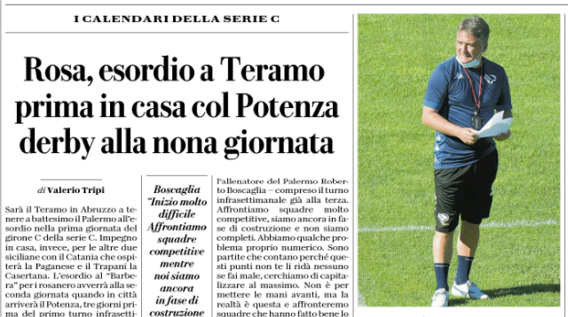 L’edizione odierna de “La Repubblica” si sofferma sul calendario del Palermo. Sarà il Teramo in Abruzzo a tenere a battesimo il Palermo all’esordio nella prima giornata del girone C di Serie C. I rosa debutteranno al “Barbera” contro il Potenza, tre giorni prima del primo turno infrasettimanale a Terni. Palermo-Bari si giocherà alla diciassettesima giornata, il 23 dicembre, con l’andata al “Barbera”e il ritorno il 14 aprile al San Nicola.