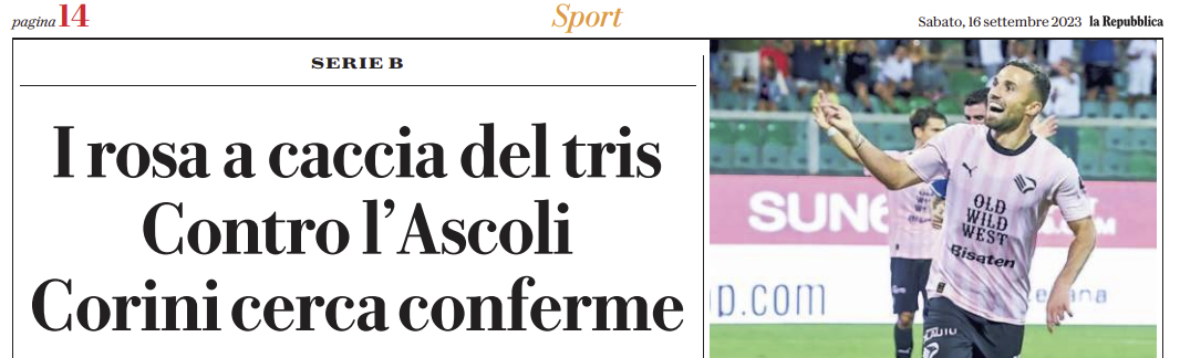 L’edizione odierna de “La Repubblica” si sofferma sul Palermo a caccia del tris contro l’Ascoli.