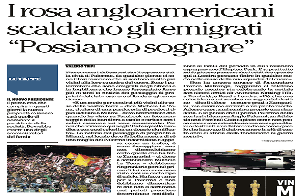 “Nonostante i chilometri che li separano dalla città di Palermo, da qualche giorno ci sono tifosi rosanero che si sentono molto più vicini alla loro squadra del cuore. Sono i palermitani che sono emigrati negli States e in Inghilterra che hanno festeggiato forse più di tutti la notizia del passaggio di proprietà del club rosanero al fondo angloamericano. «È un modo per sentirci più vicini alle cose della nostra terra – dice Michele La Tona, titolare di una pasticceria di prodotti tipici siciliani a Miami – devo ammettere che quando ho visto su Facebook un fotomontaggio della bandiera a stelle e strisce con i colori rosanero mi sono emozionato. Per noi che viviamo qui negli States quella bandiera con quei colori ha un doppio significato». La notizia del passaggio di proprietà a Miami, nel locale dove fa bella mostra di sé una maglia del Palermo incorniciata e appesa come un trofeo, è stata festeggiata «ma non dimentichiamo certo quello che ha fatto Zamparini – ci tiene a sottolineare Michele La Tona – dobbiamo ringraziarlo perché prima di lui non avevamo visto mai un certo tipo di calcio. Ha fatto tanto per il Palermo e non dobbiamo dimenticare che non ci saremmo mai potuti prendere determinate soddisfazioni come i nostri rosanero diventati campioni del Mondo». Nella pasticceria, dove va a fare colazione anche l’ex difensore di Lazio e Milan e allenatore del Miami Alessandro Nesta, quando ci sono le partite del Palermo non ci sono altri campi che tengano: l’apparecchio resta acceso sui rosanero. «A Miami non ci sono tanti palermitani – dice Michele – però quando ci sono partite importanti la gente viene qui a vedere il Palermo. Nell’ultimo periodo non sono stati tantissimi, ma adesso che la società è passata agli americani magari verrà più gente». Rispetto a Miami a New York ci sono più palermitani. «E qui sono tutti tifosissimi del Palermo – dice Pierpaolo Desi poco prima di prendere la metro nella Grande mela – la tazza che usa mio figlio di tre anni l’ho comprata al Palermo Store, è rosanero e l’ho personalizzata con il suo nome. Ora che vivo in America sono molto più tifoso di quando vivevo in Italia. Vi posso rassicurare che la mentalità pratica degli americani non potrà che fare bene alla squadra. Questa è gente che investe, preferisco un americano a Palermo piuttosto che un cinese. L’americano si innamora, come ha fatto Pallotta a Roma, assaggia lo street food ed entra subito in sintonia con la piazza. E io mi sentirò più vicino alla mia città perché adesso il Palermo sarà anche fra le notizie di sport dei giornali americani». Sono meno lontani in termini di chilometri da Palermo i tifosi emigrati a Londra, ma anche loro hanno accolto nel migliore dei modi l’ingresso di finanziatori inglesi in società. «La squadra resta uno dei pochi legami che abbiamo con la nostra città – dice Vincenzo Sortino, lavapiatti in un ristorante di Londra – negli ultimi anni i tifosi inglesi hanno iniziato a prendermi in giro. In questo mi sentivo a casa come quando da piccolo mi dicevano “Bellu Palemmu chi hai”. Adesso spero che la squadra possa tornare ai livelli del periodo in cui i rosanero espugnavano l’Hupton Park. E soprattutto mi fa piacere pensare che i soldi che spendo qui a Londra possano finire in qualche modo nelle casse della mia squadra del cuore». Non ha ancora smesso di festeggiare Franco Matranga, raggiunto al telefono proprio mentre sta celebrando la notizia con alcuni amici all’Arancina Notting Hill, a Pembridge Road a Londra. «Più che una coincidenza mi sembra un segno del destino – dice il tifoso – sempre grati a Zamparini, ma eravamo arrivati a un punto morto. Adesso questa mi sembra proprio una rinascita. E se penso che il primo Palermo della storia si chiamava Anglo Palermitan Athletic and Football Club capisco come non possa essere una coincidenza ma un segno. Siamo destinati a un futuro radioso come quello che ha avuto il club rosanero in più di cento anni di storia dalla fondazione ai giorni nostri»”. Questo quanto riportato da “La Repubblica”.
