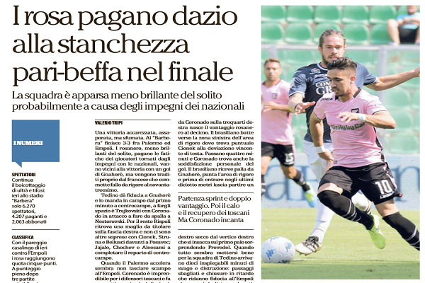 “Una vittoria accarezzata, assaporata, ma sfumata. Al “Barbera” finisce 3-3 fra Palermo ed Empoli. I rosanero, meno brillanti del solito, pagano le fatiche dei giocatori tornati dagli impegni con le nazionali, vanno vicini alla vittoria con un gol di Gnahorè, ma vengono traditi proprio dal francese che commette fallo da rigore al novantatreesimo. […]. Quando il Palermo accelera sembra non lasciare scampo all’Empoli. Coronado è imprendibile per i difensori toscani e fa ammattire nei primi dieci minuti di partita Simic. La sua pericolosità è tale che spesso i suoi avversari diretti devono ricorrere al fallo. E proprio da un calcio di punizione conquistato da Coronado sulla trequarti destra nasce il vantaggio rosanero al decimo. Il brasiliano batte verso la zona sinistra dell’area di rigore dove trova puntuale Cionek alla deviazione vincente di testa. Passano quattro minuti e Coronado trova anche la soddisfazione personale del gol. Il brasiliano riceve palla da Gnahorè, punta l’area di rigore e prima di entrare negli ultimi diciotto metri lascia partire un destro secco dal vertice destro che si insacca sul primo palo sorprendendo Provedel. Quando tutto sembra mettersi bene per la squadra di Tedino arrivano dieci inspiegabili minuti di svago e distrazione: passaggi sbagliati e chiusure in ritardo che ridanno fiducia all’Empoli che accorcia le distanze al ventitreesimo con Simic. Il gol non sembra proprio inevitabile: Untersee crossa dalla destra, la palla passa all’interno dell’area piccola, Posavec segue la sfera