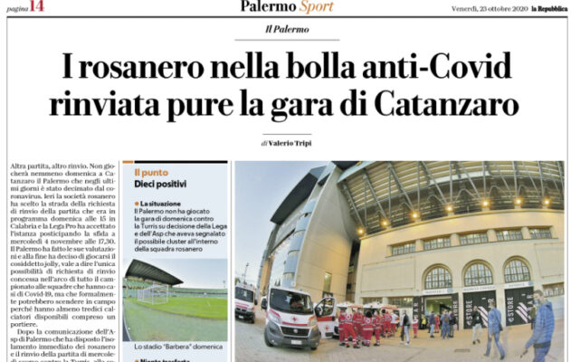 L’edizione odierna de “La Repubblica” si sofferma sul focolaio Palermo. Non si giocherà nemmeno domenica a Catanzaro: la società ha chiesto il rinvio della partita.