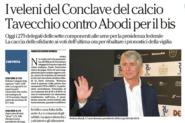 Repubblica: “I veleni del conclave del calcio. Tavecchio contro Abodi per il bis”
