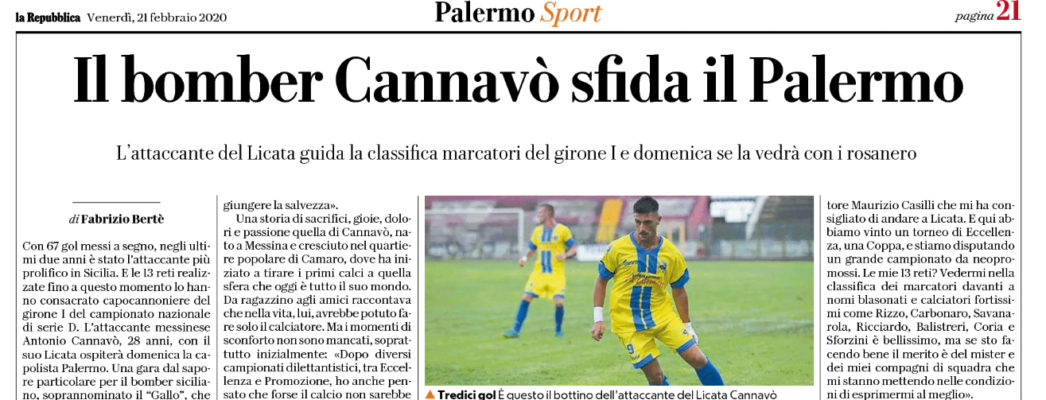 L’edizione odierna de “La Repubblica” riporta le dichiarazioni di Antonio Cannavò, attaccante del Licata: «Licata è in fermento per questa sfida – racconta – e noi ci teniamo a fare una grande prestazione davanti al nostro pubblico. Il Palermo è reduce da 5 successi e 9 risultati utili consecutivi, ma noi vogliamo riscattare la sconfitta col Savoia. Non dobbiamo dimenticarci di essere una matricola, e nonostante ciò abbiamo ben 14 punti di vantaggio sulla zona play- out. I play- off? L’obiettivo è quello di raggiungere la salvezza. Dopo diversi campionati dilettantistici, tra Eccellenza e Promozione, ho anche pensato che forse il calcio non sarebbe stata la mia strada. Ho vissuto stagioni difficili con Camaro, Villafranca e Mazzarrà, ma poi è scattato qualcosa nella mia testa. Devo ringraziare i miei genitori per avermi sempre supportato, hanno sempre creduto in me anche quando io ci credevo un po’ meno. Calcisticamente Pasquale Ferrara e Giuseppe Raffaele mi hanno dato tanto, sbloccandomi anche mentalmente. In 4 anni, con le maglie di Rocca, Igea Virtus e Milazzo, sono riuscito a segnare più di 70 gol, vincendo anche un campionato di Eccellenza con l’igea Virtus. Ho giocato appena 3 mesi al Palazzolo – ricorda – e devo ringraziare il mio procuratore Maurizio Casilli che mi ha consigliato di andare a Licata. E qui abbiamo vinto un torneo di Eccellenza, una Coppa, e stiamo disputando un grande campionato da neopromossi. Le mie 13 reti? Vedermi nella classifica dei marcatori davanti a nomi blasonati e calciatori fortissimi come Rizzo, Carbonaro, Savanarola, Ricciardo, Balistreri, Coria e Sforzini è bellissimo, ma se sto facendo bene il merito è del mister e dei miei compagni di squadra che mi stanno mettendo nelle condizioni di esprimermi al meglio. Il professionismo è un sogno – conclude – ma per il momento siamo concentrati solo sulla sfida contro il Palermo. I nostri tifosi non ci faranno mancare il proprio sostegno e noi faremo di tutto per non deluderli. A Licata ormai mi sento a casa».
