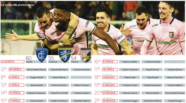 Al termine del campionato mancano 10 gare. Empoli, Frosinone e Palermo si stanno sfidando per la promozione diretta. In alto il calendario delle tre squadre da qui al termine.