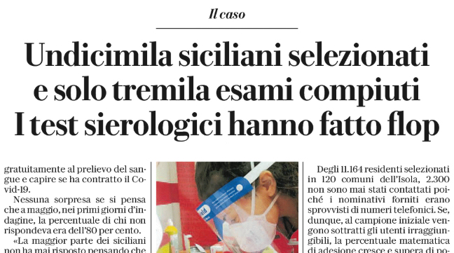 Repubblica: “Il caso. Undicimila siciliani selezionati e solo tremila esami compiuti. I test sierologici hanno fatto flop”