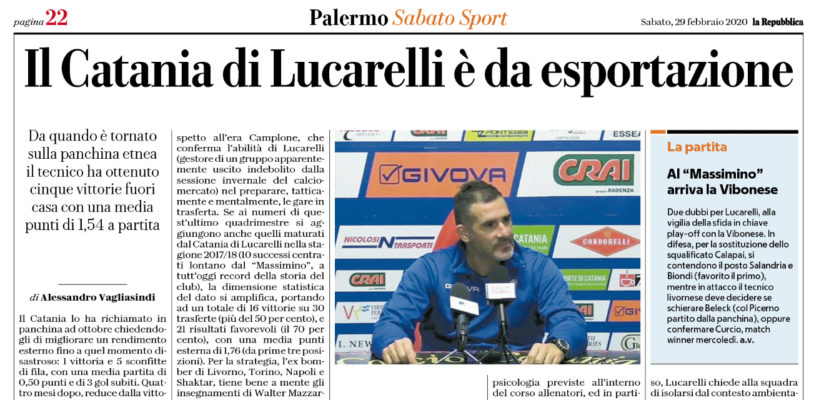 L’edizione odierna de “La Repubblica” si sofferma sul momento del Catania. Cristiano Lucarelli può esibire numeri da trasferta in netto e costante miglioramento. Sotto la gestione del tecnico livornese, inclusa la Coppa Italia, il Catania da esportazione ha totalizzato 5 vittorie (le ultime due consecutive), 2 pareggi, 4 sconfitte, con una media partita di 1,54 punti e di 1,27 gol incassati. Un rapporto favorevole di 3 a 1 rispetto all’era Camplone, che conferma l’abilità di Lucarelli (gestore di un gruppo apparentemente uscito indebolito dalla sessione invernale del calciomercato) nel preparare, tatticamente e mentalmente, le gare in trasferta. Per la strategia, l’ex bomber di Livorno, Torino, Napoli e Shaktar, tiene bene a mente gli insegnamenti di Walter Mazzarri (suo tecnico a Livorno e Napoli), secondo cui la squadra che gioca in trasferta è tatticamente avvantaggiata dal poter sfruttare gli spazi lasciati scoperti dai padroni di casa. A patto che i propri giocatori non si facciano condizionare dal fattore ambientale: aspetto emozionale su cui Lucarelli lavora in profondità sin da quando, ancora da calciatore del Napoli, nel 2011 ha iniziato a frequentare a Salerno il corso allenatori di terza categoria. La scintilla che ha acceso la fantasia dell’allora aspirante tecnico, è stata originata dalle lezioni di psicologia previste all’interno del corso allenatori, ed in particolare da uno studio sui calciatori condotto nel Regno Unito, evidenziante la presenza di un maggior numero di ormoni alla vigilia di una gara casalinga, rispetto ad analogo rilevamento effettuato prima di un match esterno. Una soglia di insicurezza, insita in chi si prepara a giocare lontano dal proprio pubblico, da superare anche attraverso un lavoro specifico da parte dell’allenatore, basato sull’assimilazione di un’uniformità prestazionale nell’approccio mentale alla partita, che si giochi in casa oppure in trasferta.