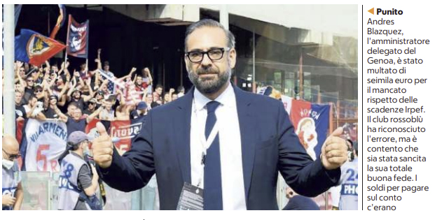 Repubblica: “Il Genoa perde un punto colpa delle scadenze Irpef: «Sbagliato in buona fede»”