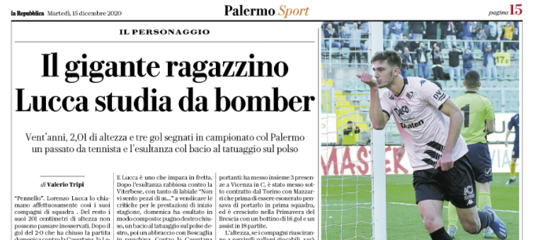 Repubblica: “Il gigante ragazzino. Lucca studia da bomber. Vent’anni, 2,01 di altezza e tre gol segnati in campionato col Palermo. Un passato da tennista e l’esultanza col bacio al tatuaggio sul polso”
