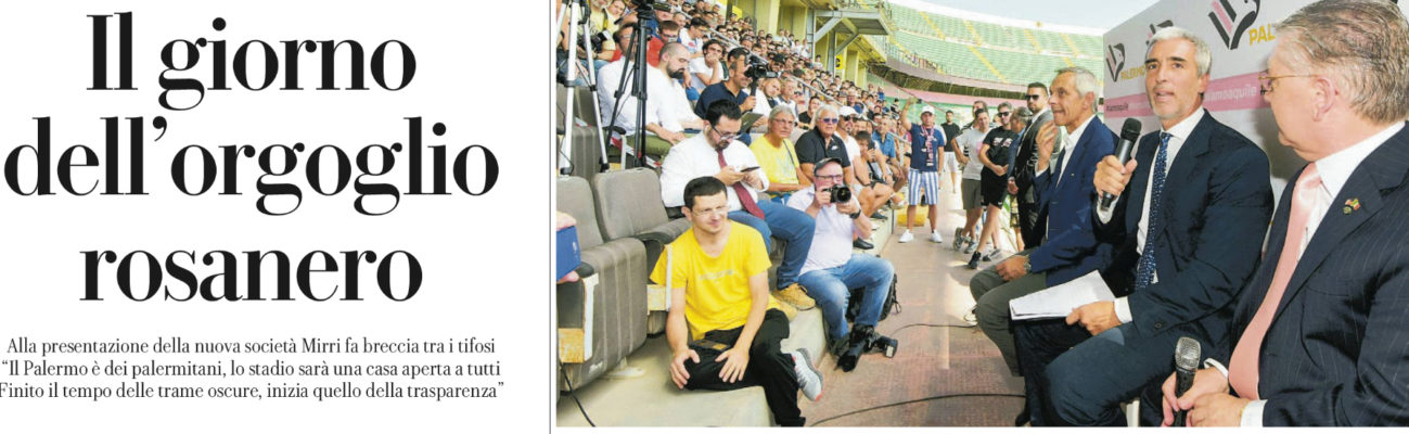 Ieri è finalmente iniziato il nuovo corso del Palermo, infatti si è tenuta la conferenza stampa di presentazione della nuova società la Hera Hora di Mirri e Di Piazza che avrà il compito di far risalire i rosanero dalle ceneri della Serie D. L’edizione odierna di “La Repubblica” fa il punto della situazione e analizza le parole dette ieri in conferenza dai nuovi protagonisti rosanero. È stata una festa. Il trionfo dell’orgoglio rosanero. Il trionfo, soprattutto, di chi in questo momento incarna più di tutti la svolta calcistica della città sintetizzabile nello slogan: “ Il Palermo ai palermitani”. Dario Mirri è stato il mattatore assoluto della presentazione della nuova società nata dalla macerie dell’Us Città di Palermo. Mirri è stato bravissimo a trasmettere questo senso di appartenenza. Questo pathos per la maglia che solo chi è veramente tifoso può capire cosa significhi. Una giornata che, per ammissione dello stesso neo proprietario della Ssd Palermo, Mirri attendeva da cinquant’anni, il nuovo presidente ha dimostrato di aver già fatto breccia tra la gente, e di gente, nonostante il caldo torrido e il sabato che avrebbe invogliato chiunque ad andare al mare, in tribuna al “ Barbera” ce n’era tantissima. A muoverli, sì la curiosità, ma anche la voglia di poter dire io c’ero. Di partecipare a qualcosa che ognuno, in qualche modo, può sentire propria.