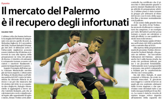 “L’ultima volta che hanno indossato la maglia del Palermo il campionato era ancora quello di serie A. Slobodan Rajkovic il 6 novembre del 2016, Norbert Balogh il 28 maggio del 2017. Il difensore serbo e l’attaccante ungherese possono essere i rinforzi che il Palermo si ritroverà in casa alla ripresa della preparazione in vista del girone di ritorno. L’obiettivo di entrambi è certamente tornare a essere calciatori e smettere finalmente i panni da lungodegenti rosanero. Seguire l’esempio dell’attaccante Gaetano Monachello sarebbe già un buon augurio. L’attaccante di Palma di Montechiaro nell’ultima partita del 2017 contro la Salernitana ha ritrovato fiducia in sé stesso e un gol che mancava dal 22 ottobre del 2016. Se si considera che a Rajkovic, Balogh e Monachello si aggiungerà a breve anche Gabriele Rolando, più che al calciomercato con le complicazioni legate alle opportunità di agire o meno, Bruno Tedino avrà almeno quattro giocatori a disposizione sui quali non ha potuto fare affidamento nel girone d’andata. E chissà che nello sprint finale non possa esserci spazio anche per Andrea Ingegneri, operato il 18 luglio per la rottura del legamento crociato e del collaterale del ginocchio sinistro, la cui prognosi era di circa otto mesi. Dovrà aspettare un po’ di più, invece, Michel Morganella. “Bobo” Rajkovic, come affettuosamente lo chiamano i compagni, è il giocatore che forse più di tutti gli altri desidera ritrovare la quotidianità fatta di allenamenti, vigilie e partite con il resto della squadra. Il difensore serbo da quando è a Palermo ha giocato tre partite e mezza e nemmeno tutte di fila. Dopo l’esordio con espulsione per doppia ammonizione alla prima giornata della stagione scorsa è tornato in campo contro il Napoli, me nella partita successiva contro il Crotone dopo nemmeno mezzora si è scontrato con Posavec subendo una frattura pluriframmentaria e scomposta delle ossa nasali. Ma il naso in quel momento era forse l’ultimo dei suoi problemi, al punto che con la mascherina protettiva si allenava regolarmente, fino ad andare in panchina a un mese dall’intervento chirurgico e giocare una partita intera contro il Milan. Quella contro i rossoneri però resta l’ultima presenza in rosanero. Il Palermo sapeva bene dei problemi del passato alle ginocchia del giocatore, con cinque infortuni gravi nei quattro anni che hanno preceduto l’ingaggio, ma tutto era ormai risolto. Un nuovo trauma proprio a Palermo gli ha causato una serie di problemi che lo hanno tenuto fuori fino ad ora: a scatenare tutto è stata una «lesione intraspongiosa del piatto tibiale postero- laterale, una lesione di I/II grado del muscolo soleo in sede prossimale e un edema su piatto tibiale mediale » . La diagnosi, nonostante i paroloni, lasciava intravedere una prognosi di circa quattro mesi, ma quel ginocchio proprio non ne voleva sapere di guarire nonostante l’intervento chirurgico subito in Belgio. Ad aprile, ogni volta che provava a forzare, il ginocchio destro si gonfiava: il motivo era una nuova lesione alle cartilagini risolta con un nuovo intervento chirurgico e una nuova prognosi di altri cinque mesi. A settembre l’ultimo controllo ha certificato che il ginocchio è clinicamente guarito e poteva iniziare finalmente la lunga attività di preparazione atletica. L’ultimo passo è stato tornare in gruppo per abituarsi al ritmo del lavoro con il resto della squadra fino a lavorare normalmente con il pallone. « È un uomo dalla grande forza morale – ha detto di lui Tedino – ha un modo di allenarsi e comportarsi da campione, è un esempio per tutti. Mi batterò perché possa tornare a essere un calciatore a tutti gli effetti. Le sue qualità tecniche non si discutono». Valori che hanno spinto il Palermo nell’estate del 2016 a metterlo sotto contratto fino al 2020. Alla ripresa della preparazione martedì prossimo Tedino ritroverà anche Norbert Balogh. «Ha passato un inferno – ha raccontato l’allenatore del Palermo – adesso anche lui è sulla buona strada, ha avuto dei problemi delicati, per me è un giocatore formidabile. Tatticamente non è paragonabile a nessuno, ma potrei compararlo a Fellaini per le caratteristiche che ha con e senza palla». Sin dal ritiro Balogh, 21 anni compiuti a febbraio, ha avuto infortuni muscolari. Il giocatore non reggeva i carichi di lavoro ai quali già era sembrato abituarsi nella scorsa stagione e che quest’anno sono diventati tutto a un tratto insopportabili per il suo fisico. La causa è stata la crescita di statura troppo veloce rispetto all’aumento della capacità dei suoi muscoli di sopportare il lavoro. Lo staff medico del Palermo ha deciso di fermare il giocatore e affrontare nei dettagli la situazione fino allo scorso novembre, giorno in cui dal Centro di alta specialità medico- sportiva “ Policlinico dello sport di Monza” è arrivato il via libera dopo test funzionali e diagnostici che hanno evidenziato finalmente un buon allineamento muscolo scheletrico. «Balogh è una grande scommessa del mio allenatore – ha detto Zamparini – L’ho visto giocare contro la Juventus e mi ha impressionato, ma quella praticamente è l’unica partita»”.