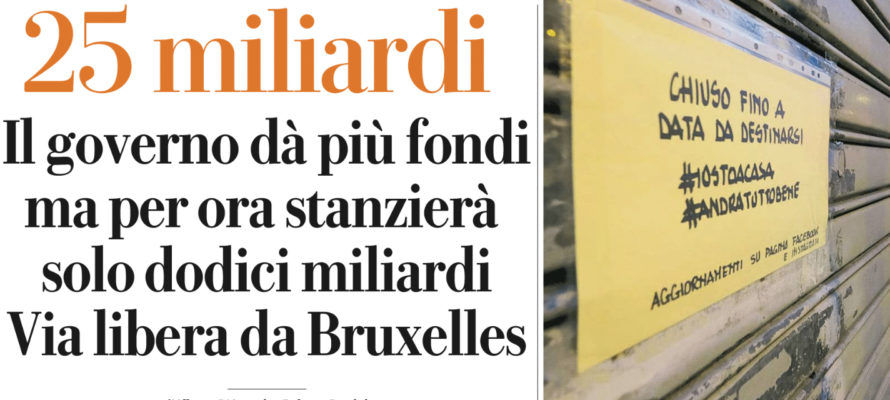 Repubblica: “Il mondo contro il virus. Italia, 25 miliardi: il governo dà più fondi ma per ora stanzierà solo 12 miliardi. Via libera da Bruxelles”