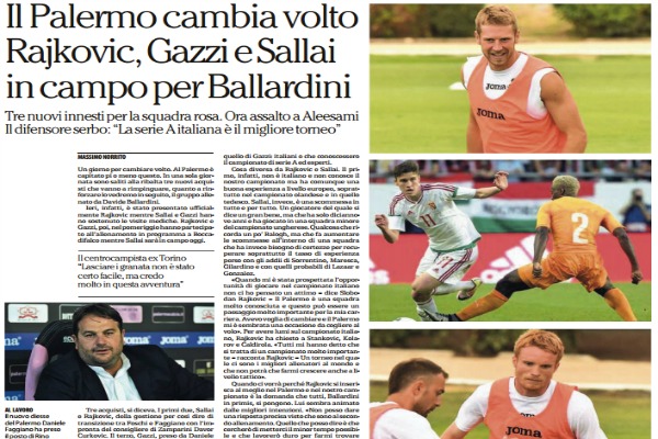 “Un giorno per cambiare volto. Al Palermo è capitato pi o meno questo. In una sola giornata sono saliti alla ribalta tre nuovi acquisti che vanno a rimpinguare, quanto a rinforzare lo vedremo in seguito, il gruppo allenato da Davide Ballardini. Ieri, infatti, è stato presentato ufficialmente Rajkovic mentre Sallai e Gazzi hanno sostenuto le visite mediche. Rajkovic e Gazzi, poi, nel pomeriggio hanno partecipato all’allenamento in programma a Boccadifalco mentre Sallai sarà in campo oggi. Tre acquisti, si diceva. I primi due, Sallai e Rajkovic, della gestione per così dire di transizione tra Foschi e Faggiano con l’impronta del consigliere di Zamparini Davor Curkovic. Il terzo, Gazzi, preso da Daniele Faggiano subentrato a Foschi nel ruolo di direttore sportivo. E, infatti, c’era proprio il neo diesse rosanero ieri mattina a Punta Raisi ad accogliere Alessandro Gazzi. Il centrocampista, trentatré anni ex del Torino, va a rinforzare il reparto di centrocampo. «Felice della mia scelta – ha detto ieri appena sbarcato in città – Credo molto in questa squadra anche se lasciare Torino non è stato facile». Del resto, proprio Ballardini aveva chieste elementi con un profilo simile a quello di Gazzi: italiani o che conoscessero il campionato di serie A ed esperti. Cosa diversa da Rajkovic e Sallai. Il primo, infatti, non è italiano e non conosce il nostro campionato ma ha comunque una buona esperienza a livello europeo, soprattutto nel campionato olandese e in quello tedesco. Sallai, invece, è una scommessa in tutto e per tutto. Un giocatore del quale si dice un gran bene, ma che ha solo diciannove anni e ha giocato in una squadra minore del campionato ungherese. Qualcosa che ricorda un po’ Balogh, ma che fa aumentare le scommesse all’interno di una squadra che ha invece bisogno di certezze per recuperare soprattutto il tasso di esperienza perso con gli addii di Sorrentino, Maresca, Gilardino e con quelli probabili di Lazaar e Gonzalez. «Quando mi è stata prospettata l’opportunità di giocare nel campionato italiano non ci ho pensato un attimo – dice Slobodan Rajkovic – Il Palermo è una squadra molto conosciuta e questo può essere un passaggio molto importante per la mia carriera. Avevo voglia di cambiare e il Palermo mi è sembrata una occasione da cogliere al volo». Per avere lumi sul campionato italiano, Rajkovic ha chiesto a Stankovic, Kolarov e Caldirola. «Tutti mi hanno detto che si tratta di un campionato molto importante – racconta Rajkovic – Un torneo nel quale ci sono i migliori allenatori al mondo e che non potrà che farmi crescere anche a livello tattico». Quando ci vorrà perché Rajkovic si inserisca al meglio nel Palermo e nel nostro campionato è la domanda che tutti, Ballardini in primis, si pongono. Lui sembra animato dalle migliori intenzioni. «Non posso dare una risposta precisa visto che sono al secondo allenamento. Quello che posso dire è che cercherò di metterci il minor tempo possibile e che lavorerò duro per farmi trovare pronto». Adesso non c’è da augurarsi che Rajkovic bruci le tappe e che le bruci anche Sallai. E, per allargare il discorso, la speranza è che anche Aleesami, il norvegese del Goeteborg a un passo dalla maglia rosanero, possa farsi trovare pronto visto che l’avvio della stagione è alle porte e che alla gara di Coppa Italia mancano una decina di giorni e qualcosina in più al via del campionato“. Questo quanto riporta l’edizione odierna de “La Repubblica”.