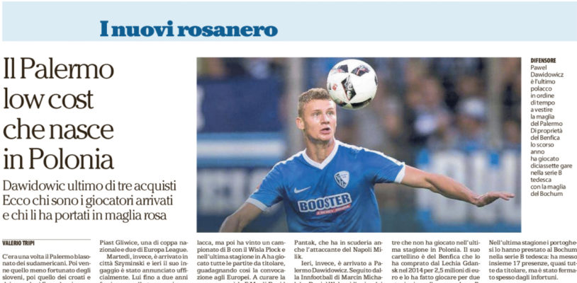Repubblica: “Il Palermo low cost che nasce in Polonia. Dawidowic ultimo di tre acquisti. Ecco chi sono i giocatori arrivati e chi li ha portati in maglia rosa”