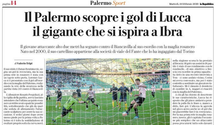 L’edizione odierna de “La Repubblica” si sofferma su Lorenzo Lucca, attaccante del Palermo. Il suo idolo è Zlatan Ibrahimovic, sogna un gol in rovesciata, ma la sua prima rete in rosanero, contro il Biancavilla, è stata con un tap-in sotto porta. «Nessun vincitore crede al caso » è stata la frase scritta da Lucca sui social. Una frase che ha spiegato a chi gliene ha chiesto il significato dicendo che «non è un caso tutto quello che succede quando si lavora duramente durante gli allenamenti». «Bravo pennellò», gli ha risposto Andrea Accardi prendendo simpaticamente in giro il suo nuovo compagno per la sua statura. Del resto i suoi due metri di altezza non passano inosservati. Due domeniche fa, quando si è presentato per la prima volta fra i convocati a Cittanova, vederlo camminare accanto ad Andrea Silipo, che di statura tocca il metro e settanta, faceva un certo effetto. E invece appena sette giorni dopo proprio la strana coppia ha regalato tre punti pesantissimi al Palermo. In estate, Mazzarri aveva scelto di trattenerlo a Torino pensando che potesse essere utile alla causa. La scelta dell’ex allenatore del Toro di fatto gli ha negato la possibilità di essere riscattato dal Brescia dopo la stagione brillante con la Primavera trascorsa allenandosi anche con la prima squadra di Eugenio Corini. Proprio a Brescia lo hanno paragonato a Luca Toni e ai più attenti il gol che ha realizzato domenica scorsa ha ricordato proprio quello realizzato dallo stesso Toni al “Barbera” contro la Roma. Lucca ha già calcato i campi di Serie C debuttando in prima squadra con il Vicenza. A chi gli ha chiesto di descrivere le sue caratteristiche, Lucca ha risposto che gli piace andarsi a prendere la palla fra le linee e, manco a dirlo, fare gol. L’altezza lo agevola nel gioco aereo anche se «il gol che mi piacerebbe fare è in rovesciata».