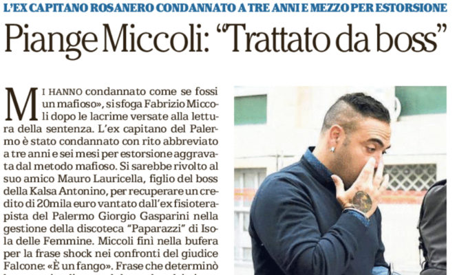“Il gol più importante l’ex capitano rosanero Fabrizio Miccoli non è riuscito a segnarlo, perdendo la partita contro il tribunale di Palermo. Dentro un’aula blindata e guardata a vista dai carabinieri il giudice per l’udienza preliminare Walter Turturici ha emesso una sentenza che è stata una doccia fredda per il bomber pugliese: tre anni e sei mesi col rito abbreviato per estorsione aggravata dal metodo mafioso. Alla richiesta di quattro anni del pubblico ministero Francesca Mazzocco il giudice ha fatto uno sconto di sei mesi tenendo conto delle attenuanti generiche, molto probabilmente della condizione di incensurato dell’ex calciatore. Nel caso in cui la sentenza dovesse passare in giudicato per la stella del calcio si aprirebbero le porte del carcere.