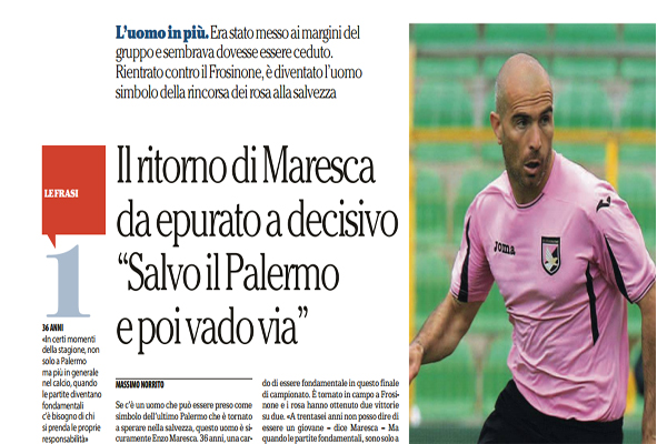 “Se c’è un uomo che può essere preso come simbolo dell’ultimo Palermo che è tornato a sperare nella salvezza, questo uomo è sicuramente Enzo Maresca. 36 anni, una carriera da incorniciare, Maresca con i suoi cinque trofeo conquistati in Spagna con la maglia del Siviglia, è di gran lunga il giocatore più titolato che abbia mai indossato la maglia rosanero. Un vincente che qualcuno, in maniera affrettata e intempestiva, avrebbe voluto rottamare e che invece adesso vede le speranze del Palermo appese alle prestazioni di Maresca e dei trentenni che stanno facendo le fortune della formazione rosanero. «Non c’è nessuna rivincita da prendere – dice il regista rosanero – A trentasei anni non è certo tempo di rivincite. Io ho sempre saputo quello che potevo dare a questa squadra. In alcuni momenti questo mi è stato impedito farlo, ma adesso le mie emozioni sono tutte concentrate sul bene della squadra. Mancano quindici giorni alla fine del campionato. Negli ultimi pesi ho avuto tanto tempo per pensare alla mia situazione che, del resto, era palese a tutti. Adesso, invece, penso solo alla squadra». Una squadra che nelle ultime settimane ha trovato finalmente una sua quadratura con l’inserimento di elementi come appunto Maresca. Lui se la cava con un diplomatico: «non bisogna chiedere a me perché questa quadratura del cerchio sia arrivata solo adesso». La diplomazia lascia spazio, invece, alla concretezza quando si parla del rapporto con Ballardini che, nella sua prima gestione, lo aveva messo fuori rosa all’indomani della sconfitta in Coppa Italia contro l’Alessandria. «Ci siamo ritrovati a Coccaglio in ritiro – dice Maresca – Quando si affronta una situazione come quella che stiamo vivendo noi, tutti gli scontri che possono esserci stati in passato vengono messi da parte per il bene di tutti. Abbiamo un obiettivo da raggiungere e quindi tutto il resto viene accantonato». A trentasei anni, Maresca sta dimostrando di essere fondamentale in questo finale di campionato. È tornato in campo a Frosinone e i rosa hanno ottenuto due vittorie su due. «A trentasei anni non posso dire di essere un giovane – dice Maresca – Ma quando le partite fondamentali, sono solo a Palermo, c’è chi è chiamato a prendersi le sue responsabilità». E nel Palermo, questa figura è rappresentata proprio da Maresca, ma anche da Sorrentino, Gilardino, Vitiello, Rispoli. «Noi ci crediamo – dice il regista – Sappiamo che in due partite ci giochiamo tutto. La realtà può essere bella, ma può essere anche brutta. Noi lavoriamo perché sia la più bella possibile». Il futuro del Palermo che s’intreccia con quello dei singoli. Il Palermo di oggi sarà molto diverso da quello di domani. In molti, tra cui Maresca, hanno già la valigia pronta. «Il mio contratto è in scadenza e quindi il prossimo anno non sarò a Palermo – dice – Ma io e i miei compagni vogliamo lasciare un buon ricordo. Retrocedere sarebbe un fallimento per tutti. Sino a qualche tempo fa ci davano per spacciati. Adesso abbiamo qualche speranza in più e vogliamo giocarcela sino in fondo». Per giocarsela sino in fondo il Palermo deve fare sei punti. In questo modo avrebbe la certezza di rimanere in A. «Andiamo a Firenze per vincere – dice Maresca – Dobbiamo cercare di fare sei punti senza pensare alle nostre dirette concorrenti. Il biscotto all’ultima giornata tra Udinese e Carpi? Non ci voglio pensare, ma se dovessimo retrocedere non sarebbe certo per l’ultima partita, ma sarebbe una retrocessione nata prima»”. Questo quanto si legge sull’edizione odierna de “La Repubblica”.