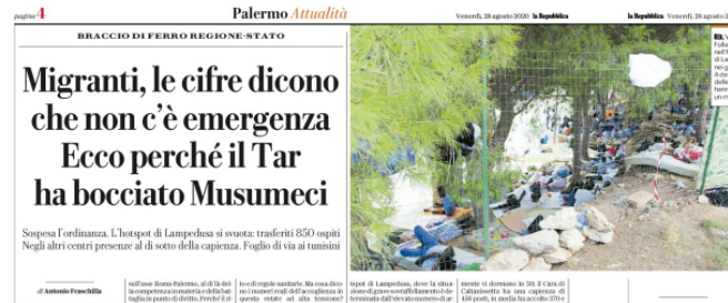 L’edizione odierna de “La Repubblica” si sofferma sull’ordinanza di Musumeci sospesa dal TAR di Palermo. Le fondamenta dell’atto: «Va oltre i poteri delle Regioni e non c’è stata una rigorosa istruttoria per dimostrare l’esistenza di un concreto aggravamento del rischio sanitario legato alla diffusione del Covid tra la popolazione locale quale conseguenza del fenomeno migratorio».