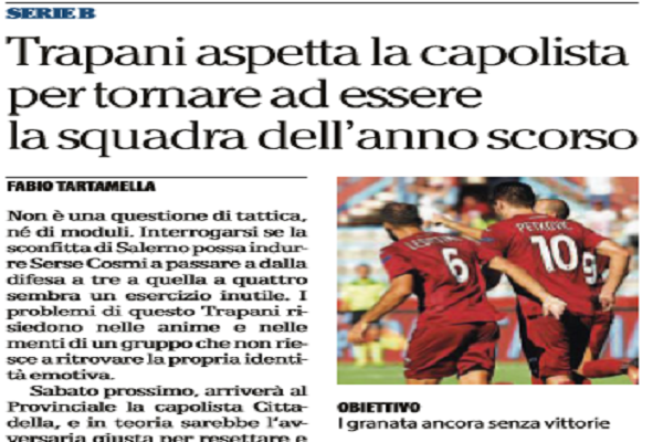 “Non è una questione di tattica, né di moduli. Interrogarsi se la sconfitta di Salerno possa indurre Serse Cosmi a passare a dalla difesa a tre a quella a quattro sembra un esercizio inutile. I problemi di questo Trapani risiedono nelle anime e nelle menti di un gruppo che non riesce a ritrovare la propria identità emotiva. Sabato prossimo, arriverà al Provinciale la capolista Cittadella, e in teoria sarebbe l’avversaria giusta per resettare e ricominciare a credere in se stessi. È vero che la formazione veneta ha sporcato il suo straordinario avvio di stagione con la sconfitta casalinga dell’ultimo turno contro il Brescia: ma si tratta pur sempre della prima in classifica, capace finora di stupire tutti. Non sfugge la necessità, quindi, di voltar pagina, di chiudere finalmente in un cassetto i ricordi e provare a costruire una nuova chimica. «Abbiamo fallito approccio, sbagliato tanti passaggi in uscita, e il nostro atteggiamento non è mai stato quello giusto». A metterci la faccia è il capitano Luca Pagliarulo, spiegando così l’ultima prestazione, ma facendo anche riferimento a queste prime sei giornate di campionato. È il momento, insomma, di recuperare le responsabilità individuali. Se a lungo, lo scorso anno, la formazione granata era sembrata più matura della città, nella gestione della lotta per la serie A, adesso le parti sembrano invertite. I tifosi attendono solo di vedere in campo una squadra che recuperi lo spirito battagliero, e non pretendono il raggiungimento di qualsiasi obiettivo ambizioso. Nessuna particolare pressione, quindi, neanche nella sfida al Cittadella, in cui Cosmi sarà costretto ad inventarsi un centrocampo nuovo di zecca. Nel reparto nevralgico, infatti, saranno assenti Scozzarella, Coronado, Machin, Ciaramitaro e Raffaello, tutti infortunati. Probabile il recupero di Nizzetto, ma il tecnico granata si ritroverà con gli uomini contati. Poi gli toccherà anche investire su un modulo (3-5-2 o 4-3-1-2), ma sono solo dettagli. Battere la capolista sarà un obiettivo possibile solo se il Trapani saprà riscoprire le sue radici: umili e da combattimento.”. Questo quanto riportato da “La Repubblica”.