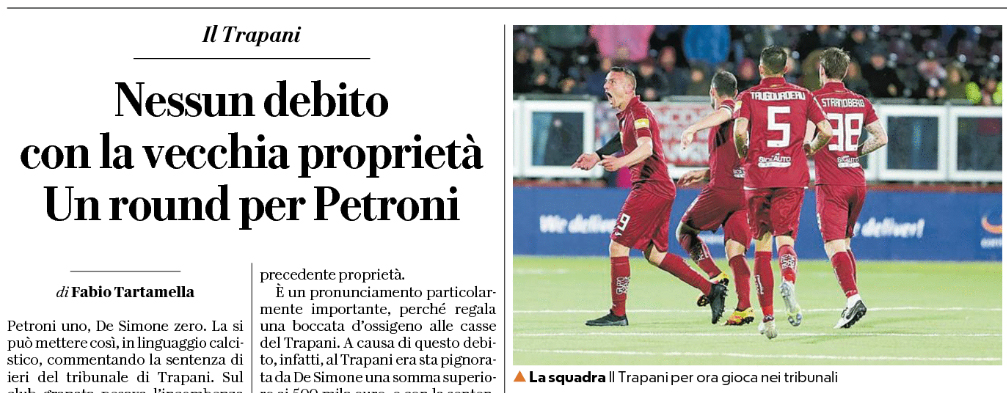 Repubblica: “Il Trapani, nessun debito con la vecchia proprietà. Un round per Petroni”