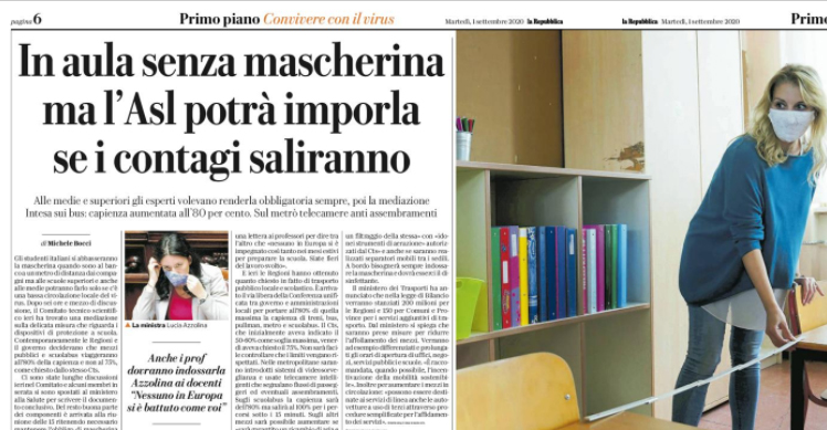 Repubblica: “In aula senza mascherina ma l’Asl potrà imporla se i contagi saliranno”