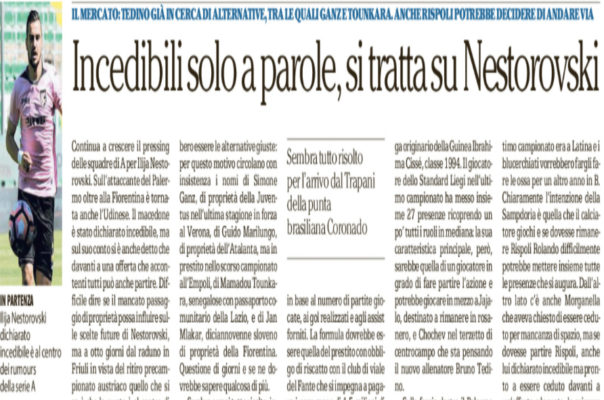 “Continua a crescere il pressing delle squadre di A per Ilija Nestorovski. Sull’attaccante del Palermo oltre alla Fiorentina è tornata anche l’Udinese. Il macedone è stato dichiarato incedibile, ma sul suo conto si è anche detto che davanti a una offerta che accontenti tutti può anche partire. Difficile dire se il mancato passaggio di proprietà possa influire sulle scelte future di Nestorovski, ma a otto giorni dal raduno in Friuli in vista del ritiro precampionato austriaco quello che si sa è che la punta è al centro di sondaggi dalla serie A. E che il Palermo, per non farsi trovare impreparato in caso di cessione, sta cercando di capire quali potrebbero essere le alternative giuste: per questo motivo circolano con insistenza i nomi di Simone Ganz, di proprietà della Juventus nell’ultima stagione in forza al Verona, di Guido Marilungo, di proprietà dell’Atalanta, ma in prestito nello scorso campionato all’Empoli, di Mamadou Tounkara, senegalose con passaporto comunitario della Lazio, e di Jan Mlakar, diciannovenne sloveno di proprietà della Fiorentina. Questione di giorni e se ne dovrebbe sapere qualcosa di più. Sembra ormai tutto risolto, invece, per l’arrivo di Igor Coronado dal Trapani. Il giocatore brasiliano dovrebbe firmare un contratto quadriennale con bonus in base al numero di partite giocate, ai gol realizzati e agli assist forniti. La formula dovrebbe essere quella del prestito con obbligo di riscatto con il club di viale del Fante che si impegna a pagare i poco meno di 1,5 milioni di euro di cartellino nell’arco di tre stagioni. A centrocampo si segue con attenzione il centrocampista belga originario della Guinea Ibrahima Cissé, classe 1994. Il giocatore dello Standard Liegi nell’ultimo campionato ha messo insieme 27 presenze ricoprendo un po’ tutti i ruoli in mediana: la sua caratteristica principale, però, sarebbe quella di un giocatore in grado di fare partire l’azione e potrebbe giocare in mezzo a Jajalo, destinato a rimanere in rosanero, e Chochev nel terzetto di centrocampo che sta pensando il nuovo allenatore Bruno Tedino. Sulla fascia destra il Palermo rischia di avere un giocatore di troppo: vicino l’ingaggio di Gabriele Rolando, classe 1995, della Sampdoria. Il giocatore nell’ultimo campionato era a Latina e i blucerchiati vorrebbero fargli fare le ossa per un altro anno in B. Chiaramente l’intenzione della Sampdoria è quella che il calciatore giochi e se dovesse rimanere Rispoli Rolando difficilmente potrebbe mettere insieme tutte le presenze che si augura. Dall’altro lato c’è anche Morganella che aveva chiesto di essere ceduto per mancanza di spazio, ma se dovesse partire Rispoli, anche lui dichiarato incedibile ma pronto a essere ceduto davanti a un’offerta adeguata, lo svizzero potrebbe anche rivedere la sua posizione.”. Questo quanto si legge sull’edizione odierna de” La Repubblica”.