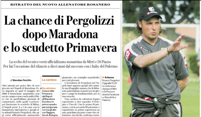 L’edizione odierna di “Repubblica” parla del nuovo allenatore del Palermo Rosario Pergolizzi. Il 15 maggio del 1988, il tecnico palermitano, scese in campo per 8 minuti nel match che il Napoli perse 2-1 contro la Sampdoria. Entrò all’82 esimo e fino a pochi istanti prima era seduto in panchina insieme a ex rosanero come Pino Taglialatera e Billy Bigliardi. Pergolizzi, aggregato alla prima squadra come punto di forza dell Primavera, ebbe la fortuna di conoscere Maradona. La sua carriera da calciatore tuttavia, conta la maggior parte delle presenze tra Bologna e Ascoli, 91 con gli emiliani e 99 con i bianconeri con i quali ha anche iniziato anche la propria esperienza da allenatore come vice-tecnico. A Palermo però – si legge – Pergolizzi ha conquistato quello che ad oggi è il suo più importante trofeo, lo scudetto Primavera del 2009. In quella squadra c’erano Mazzotta, Abel Hernandez, Cossentino e  Misuraca. Nonostante gli elementi di quella Primavera non ebbero poi tanta fortuna, Pergolizzi riuscì ad arrivare sulla panchina della prima squadra in serie A sostituendo Guidolin. Nel calcio “vero” però, le cose per il tecnico palermitano non sono andate molto bene, a Pavia in Lega Pro si è dimesso dopo un pareggio e cinque sconfitte in sei gare, mentre sulla Panchina dell’Ascoli raccoglie solo una vittoria e tre sconfitte. Poi ancora il ritorno ad Ascoli e la serie D con il Marsala, ma adesso Pergolizzi deve dimostrare che lo scudetto Primavera non è stata solo una parentesi della sua carriera.