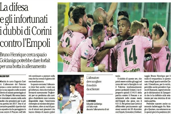 “Mischia le carte Eugenio Corini. L’allenatore del Palermo pensa a come mettere in campo la sua squadra nello scontro diretto di sabato pomeriggio alle 18 a Empoli. Ma senza lasciare intendere ancora nulla sulle scelte che prenderà per la prima partita del 2017. Due le alternative possibili: ripartire dalla squadra che ha pareggiato in casa contro il Pescara nell’ultima partita o cambiare qualcosa per trovare il passo giusto e rilanciare la corsa salvezza alla vigilia di un ciclo di partite dure che metterà i rosanero di fronte a Sassuolo, Inter e Napoli. Dal mercato ancora non sono arrivati rinforzi e per la prima partita dell’anno Corini dovrà continuare a puntare sulla rosa che ha trovato il giorno del suo insediamento. In questo contesto l’allenatore deve fare anche i conti con gli infortuni, visto che rischia di fermarsi nuovamente Trajkovski per un problema alla caviglia e Andelkovic non è ancora disponibile dopo l’intervento chirurgico al menisco del ginocchio destro, oltre ai mal di pancia di alcuni suoi giocatori che hanno chiesto di essere ceduti o che sono già andati via. È il caso di Hiljemark che ha chiesto di cambiare aria e di Bouy che non è rientrato dopo le vacanze, sia pure in accordo con la società. Se il Palermo cambierà pelle per quanto riguardo i suoi giocatori si capirà in corso di mercato; a Empoli invece Corini si aspetta che la sua squadra cambi atteggiamento, soprattutto nei minuti finali di partita, nel lasso di tempo in cui i rosanero hanno già perso diversi punti dall’inizio del campionato. Sempre a proposito dell’infermeria, inoltre, solamente oggi si saprà se Aleesami e Goldaniga potranno essere considerati fra gli arruolabili: il primo ieri è rimasto a riposo per l’influenza, il secondo ha saltato la partitella di fine allenamento di ieri pomeriggio per un leggero infortunio. Il dubbio di queste ore, che potrà essere sciolto già oggi nel corso del test in famiglia in cui il Palermo tradizionalmente prova i probabili titolari, è se riproporre quindi il 3-4-2-1 della partita contro il Pescara o se schierarsi nello stesso modo dell’Empoli che gioca con il 4-3-1-2. Nel primo caso Corini si affiderebbe praticamente agli stessi uomini del 22 dicembre con Cionek, Gonzalez e Goldaniga in difesa davanti a Posavec; i due mediani Gazzi e Jajalo a centrocampo con Rispoli e Aleesami sulle fasce; i due trequartisti Diamanti e Quaison alle spalle di Nestorovski. Se invece la scelta dovesse ricadere su un modulo simile a quello dell’Empoli, potrebbe entrare in ballottaggio Bruno Henrique per il ruolo di trequartista: in questo caso a fargli spazio sarebbe Cionek. Il brasiliano, per la verità, potrebbe anche prendere il posto di Diamanti, soprattutto dopo le dichiarazioni di Zamparini che lo ha definito utile solamente per una trentina di minuti a partita. Potrebbe nascere anche un secondo ballottaggio fra Balogh e Quaison, ma solamente se in questi giorni la posizione dello svedese dovesse irrigidirsi sulla questione del rinnovo di contratto che andrà in scadenza a giugno. Le parti, infatti, al momento non sembrano vicine all’accordo e una delle ipotesi in pista potrebbe anche essere la cessione a gennaio.”. Questo quanto si legge sull’edizione odierna de “La Repubblica”.