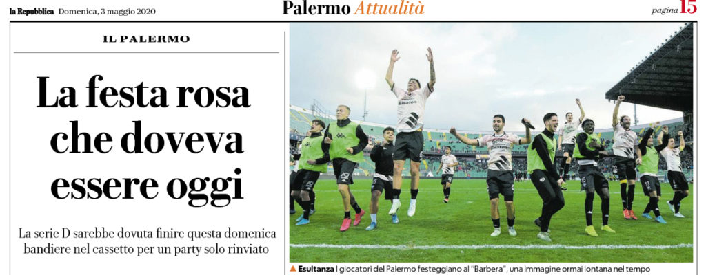 L’edizione odierna de “La Repubblica” ricorda che il campionato di Serie D sarebbe dovuto terminare oggi. Le sciarpe rosanero rimarranno nelle case di tutti i tifosi del Palermo. Alle 15 si sarebbe dovuta giocare l’ultima partita, al ” Silvio Proto” di Troina, poi al fischio finale una lunga processione di tifosi dall’Ennese fino al rientro in città per la festa. In molti l’avevano pensata così e non poteva essere diversamente, visto che sarebbe stata la prima promozione con il ritorno fra i professionisti dopo la radiazione. Molto probabilmente, la Lega Pro sarà il campionato dove giocherà il Palermo in caso di sospensione del campionato.