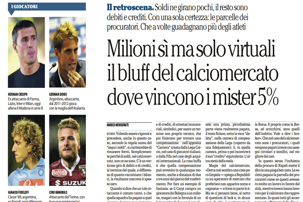 “Volendo essere rigorosi e procedere, anche in questo caso, secondo la regola aurea del “segui i soldi”, si rischierebbe di rimanere fermi. Semplicemente perché di soldi, nel calciomercato, non ce ne sono. C’è un vorticoso giro di debiti e di crediti, al termine del quale, a differenza di quanto raccontano i bilanci, la risultante concreta è spesso zero. Quando si dice che un tale attaccante è costato tanto, o che quella squadra ha pagato x quel giovane, dunque, non si sta parlando di soldi ma “solo” di debiti e di crediti, di attestati immateriali, simbolici, per usare un termine non proprio tecnico, che poi finiscono per trovare una compensazione nell’apposita “Camera” creata dalla Lega Calcio, nel caso di giocatori italiani; o dalla Fifa nel caso degli acquisti internazionali. La cosa buffa è che quella compensazione può avvenire in qualunque momento, anche a distanza di due o tre anni dal giorno del trasferimento. Per fare un esempio di fantasia: se il Carpi compra un giocatore dal Bologna a un milione, magari con la formula di un bel prestito di due anni con obbligo di riscatto, di quella cifra solo una prima, piccolissima parte viene realmente pagata, il resto finisce, sotto la voce “debito”, nella camera di compensazione della Lega (coperto da una fidejussione); lì, in quella camera, prima o poi incontrerà il suo “credito” equivalente. L’altra metà della mela. Magie del calciomercato. «Detta così sembra una cosa poco limpida — spiega a Repubblica un operatore di mercato che preferisce non apparire nome e cognome — e forse in parte lo è. Ma se ci pensate bene, al netto di questioni di look e, in alcuni casi, di stile, è esattamente lo stesso meccanismo che regola la Borsa. E proprio come la Borsa, ad arricchirsi, sono quelli dell’indotto. Vale a dire i broker». Che nel caso del calciomercato sono i procuratori, i quali vengono pagati invece con assegni circolari e bonifici, nel migliore dei casi. In questo senso l’inchiesta della procura di Napoli mette il dito in una piaga ben nota. Le società pagano la parcella dei procuratori come se questi avessero svolto un lavoro in favore del club, mentre invece hanno lavorato per il calciatore che rappresentano. In quasi tutti gli accertamenti effettuati dalla Finanza negli ultimi anni, i militari hanno sempre osservato quello che chiamano, «lo strano fenomeno del 5 per cento». Vale a dire la curiosa circostanza per cui gli importi dovuti ai procuratori dai club, coincidevano sempre e con un’esattezza disarmante al 5 per cento lordo dello stipendio annuo del calciatore. Insomma, un trucchetto. Ma di trucchetti, il rapporto triangolare tra procuratori, società e calciatori, è pieno zeppo. Come dimostra, in altri casi, la clamorosa sproporzione tra quanto liquidato al procuratore e gli emolumenti percepiti dal calciatore: negli ultimi anni non è stato infrequente che un giocatore finisse per guadagnare molto meno del suo procuratore. Più volte, in Italia, il fisco e le procure hanno provato a mettere mano a questo nodo. Spesso fallendo. All’estero sono intervenuti a livello legislativo. «In Spagna — spiega ancora l’operatore di mercato — hanno risolto con la cosiddetta legge Beckham che in realtà era stata fatta per attirare gli investimenti delle multinazionali. L’attività del procuratore che intermedia e che era pagata dal club era tassata con il 25 per cento. Cedolare secca per cinque anni. E fine. Il vero scandalo è che gente come de Laurentiis, Galliani e Lotito, lobbisti professionisti, non siano riusciti a imporre una cosa del genere anche allo stato italiano. E così finiscono periodicamente preda delle procure e dei finanzieri». Che adesso rischiano di impazzire definitivamente appresso al fenomeno del Tpo, third party ownership. I calciatori non appartengono più ai club, ma a terze parti. Spesso fondi di investimento. Cosa perfettamente legale, in teoria. «In pratica, però, capita spesso che questi fondi abbiano sede a Malta o ai Caraibi e triangolino abitualmente con i club di Serie A, ma anche della Liga o della Premier. Lavorando sulle plusvalenze dei crediti e dei debiti del calciomercato, questi fondi alla fine riescono a mettere insieme liquidità spaventose». E chissà dove si potrebbe arrivare seguendo quelli, di soldi”. Questo è quanto si elgge sull’edizione odierna de “La Repubblica”.
