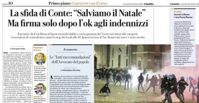 Repubblica: “La sfida di Conte “Salviamo il Natale”. Ma firma solo dopo l’ok agli indennizzi”