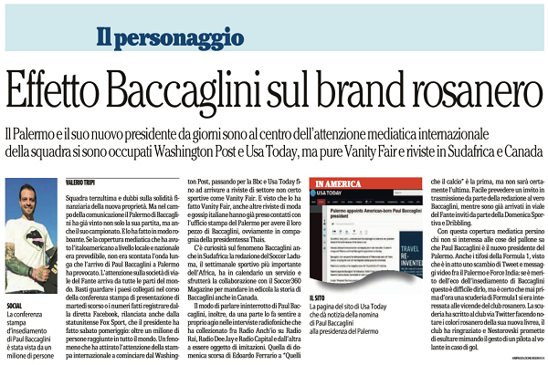 “Squadra terzultima e dubbi sulla solidità finanziaria della nuova proprietà. Ma nel campo della comunicazione il Palermo di Baccaglini ha già vinto non solo la sua partita, ma anche il suo campionato. E lo ha fatto in modo roboante. Se la copertura mediatica che ha avuto l’italoamericano a livello locale e nazionale era prevedibile, non era scontata l’onda lunga che l’arrivo di Paul Baccaglini a Palermo ha provocato. L’attenzione sulla società di viale del Fante arriva da tutte le parti del mondo. Basti guardare i paesi collegati nel corso della conferenza stampa di presentazione di martedì scorso o i numeri fatti registrare dalla diretta Facebook, rilanciata anche dalla statunitense Fox Sport, che il presidente ha fatto sabato pomeriggio: oltre un milione di persone raggiunte in tutto il mondo. Un fenomeno che ha attirato l’attenzione della stampa internazionale a cominciare dal Washing