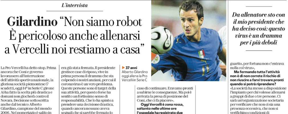 Repubblica: “L’ex rosa Gilardino «Non siamo robot. È pericoloso anche allenarsi a Vercelli, noi restiamo a casa»”
