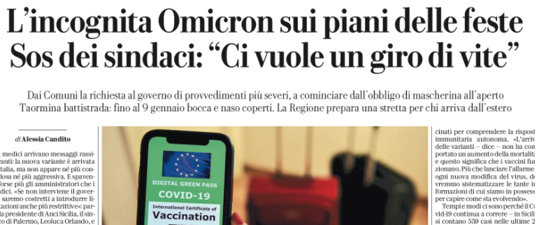 Repubblica: “L’incognita Omicron sui piani delle feste. Sos dei sindaci: «Ci vuole un giro di vite»”