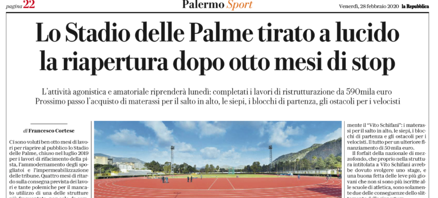 L’edizione odierna de “La Repubblica” si sofferma sulla riapertura dello “Stadio delle Palme”, chiuso nel luglio 2019 per i lavori di rifacimento della pista, ammodernamento degli spogliatoi e impermeabilizzazione delle tribune. Quattro mesi di ritardo sulla consegna prevista dei lavori e tante polemiche per il mancato utilizzo di una delle strutture più frequentate, non solo da semplici amatori, ma soprattutto da veri professionisti dell’atletica. Lunedì prossimo i cancelli dell’impianto di viale del Fante, realizzato negli anni Cinquanta, riaprirà i cancelli. «Questa importante struttura torna allo splendore che aveva perso – commenta il sindaco di Palermo Leoluca Orlando – Adesso l’atletica leggera potrà avere un punto di riferimento significativo». Secondo il regolamento comunale attuale, però, solamente i tesserati delle società sportive potranno utilizzare l’impianto. I singoli atleti dovranno invece pagare al Comune un abbonamento annuale pari a 40 euro. Pista d’atletica rifatta completamente con materiale di ultima generazione, la gabbia per i lanciatori del disco e del peso che torna utilizzabile e una nuova fossa per i salti in lungo. Il tutto realizzato con fondi comunitari per un importo complessivo di 590 mila euro.