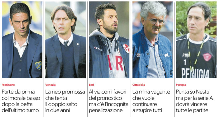 “Il Frosinone è fra le cinque pretendenti alla A quella che arriva con il morale più basso di tutti. A un minuto dalla fine dell’ultima giornata della stagione regolare i ciociari erano in A. Poi il gol del pareggio del Foggia ha cambiato il corso della storia. L’allenatore Moreno Longo dovrà cancellare dalla testa dei suoi giocatori la delusione per l’epilogo di questo campionato e i fantasmi di come si è conclusa la stagione passata. Oltre alla promozione diretta sfumata all’ultimo momento quest’anno, il Frosinone deve fare i conti con quanto accaduto nello scorso campionato quando i gialloblu si qualificarono proprio come oggi da terzi in classifica per gli spareggi promozione e volarono direttamente in semifinale. Ma vennero eliminati dal Carpi pareggiando in trasferta all’andata e perdendo in casa per 1-0. Adesso i ciociari in semifinale attendono la vincente fra Cittadella e Bari. Non potranno contare sugli infortunati Daniel Ciofani e Lorenzo Ariaudo, ma potrebbe recuperare Raffaele Maiello. Longo in questo momento non ha certezze, oltre che sul tipo di risposte che potrà avere dai suoi giocatori, anche a proposito del modulo: l’allenatore pensa a un ritorno alla difesa a tre. Dopo la partita di venerdì scorso la squadra ha usufruito di tre giorni di riposo e ha ripreso la preparazione con un programma di lavoro normale fra parte atletica e tattica. Longo batterà molto sugli errori individuali che hanno causato il gol in contropiede del Foggia nato da una palla persa sulla trequarti in attacco.