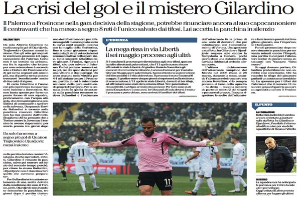 “Da solo Alberto Gilardino ha realizzato più gol di Djurdjevic, Trajkovski e Quaison messi insieme. Con gli otto gol segnati in ventinove presenze è il capocannoniere del Palermo. Certo non è un bottino da primato, ma fra le squadre che lottano per non retrocedere è secondo solo a Ciofani del Frosinone che di gol ne ha segnati solo uno in più, ma di partite ne ha giocate trentatré beneficiando anche di due calci di rigore. Di certo Gilardino è l’uomo con più esperienza in casa rosanero insieme a Sorrentino. Ma non basta questo per farne un punto fermo di una squadra, praticamente con l’acqua alla gola, che domani si gioca la possibilità di continuare a sperare nella salvezza. Da quando Davide Ballardini è tornato sulla panchina rosanero Gilardino non ha mai giocato dall’inizio. Sbagliava chi ha pensato che a Torino contro la Juventus il tecnico lo avesse risparmiato per averlo pronto tre giorni dopo nella partita decisiva contro l’Atalanta. Anche mercoledì, infatti, Gilardino è rimasto in panchina, salvo poi entrare ad inizio del secondo tempo perché, per citare lo stesso Ballardini, «Djurdjevic non è riuscito a fare quello che avevamo preparato». Per Ballardini si è trattato solamente di una scelta dettata dalla condizione dei suoi. A Torino, però, Djurdjevic non è andato nemmeno in panchina, tre giorni dopo è partito titolare contro l’Atalanta. Alla vigilia della partita contro i bergamaschi, per la verità, per Ballardini Gilardino aveva un fastidio al ginocchio, una circostanza che non ha trovato conferme né sui notiziari medici ufficiali del club, né in ambienti vicini al giocatore. Strana parabola quella di Gilardino. Da nemico numero uno dei tifosi rosanero per il famoso gol di mano segnato sotto la curva nord quando giocava con la maglia della Fiorentina, fino a unico giocatore risparmiato dagli strali sui social e nei commenti al bar dello sport. Anzi, tutti concordi: Gilardino deve giocare. È l’unico, ripetono i tifosi, che può salvare il Palermo. Per lui parlano i numeri: otto gol, tre dei quali decisivi per una vittoria e due pareggi. Un altro segnato nella vittoria per 4-1 all’andata contro il Frosinone, partita in cui è subentrato nel corso della gara sostituendo proprio Djurdjevic. Per la cronaca anche in quella circostanza sulla panchina rosanero sedeva Ballardini e l’esclusione dell’attaccante fu la prima di una serie di decisioni che poi culminarono con l’ammutinamento di Verona. Una gestione a staffetta fra Gilardino e Djurdjevic sospesa solo contro la Sampdoria a Genova, pochi giorni dopo una distorsione alla caviglia subita dal serbo in allenamento. L’ultima dichiarazione dell’attaccante campione del Mondo nel 2006 risale al 26 marzo, durante la sosta, quando l’allenatore dei rosanero era ancora Novellino. «Ho sempre pensato al bene della squadra — ha detto — bisogna mettere da parte gli obiettivi dei singoli e pensare al gruppo. Bisogna rispettare le scelte dell’allenatore e farsi trovare pronti: tutti vogliono giocare, ma l’importante è fare punti». Parole pronunciate dopo essere rimasto in panchina per novanta minuti contro l’Empoli, una partita in cui però l’allenatore scelse di giocare senza attaccanti con Vazquez “falso nueve”. Se oggi dovesse parlare, Gilardino probabilmente non sarebbe così conciliante. Chi ha raccolto lo sfogo del giocatore parla di un attaccante arrabbiato. La speranza per i tifosi del Palermo è che il numero 11 rosanero possa sfogare la sua carica agonistica contro il Frosinone”. Questo quanto si legge sull’edizione odierna de “La Repubblica”.
