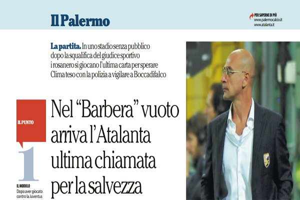 Repubblica: “Nel «Barbera» vuoto arriva l’Atalanta. Ultima chiamata salvezza”