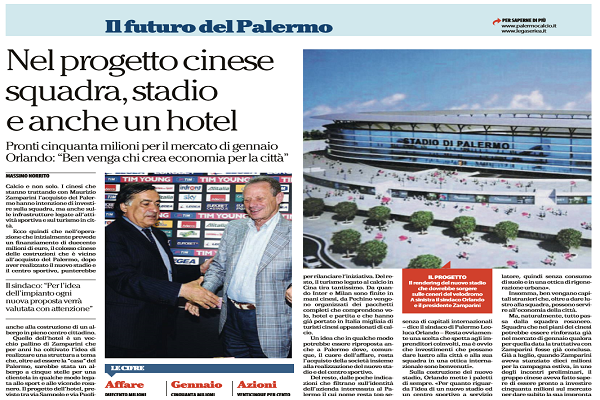 “Calcio e non solo. I cinesi che stanno trattando con Maurizio Zamparini l’acquisto del Palermo hanno intenzione di investire sulla squadra, ma anche sulle infrastrutture legate all’attività sportiva e sul turismo in città. Ecco quindi che nell’operazione che inizialmente prevede un finanziamento di duecento milioni di euro, il colosso cinese delle costruzioni che è vicino all’acquisto del Palermo, dopo aver realizzato il nuovo stadio e il centro sportivo, punterebbe anche alla costruzione di un albergo in pieno centro cittadino. Quello dell’hotel è un vecchio pallino di Zamparini che per anni ha coltivato l’idea di realizzare una struttura a tema che, oltre ad essere la “casa” del Palermo, sarebbe stata un albergo a cinque stelle per una clientela in qualche modo legata allo sport e alle vicende rosanero. Il progetto dell’hotel, previsto tra via Sampolo e via Puglisi su una superficie di circa 12.500 metri quadrati, prevedeva 189 camere doppie e 8 superior oltre a piscina, centro benessere e area attrezzata. Un progetto ambizioso che è da tempo finito in un cassetto. Cassetto dal quale i cinesi sarebbero pronti a tirarlo fuori per rilanciare l’iniziativa. Del resto, il turismo legato al calcio in Cina tira tantissimo. Da quando Inter e Milan sono finite in mani cinesi, da Pechino vengono organizzati dei pacchetti completi che comprendono volo, hotel e partita e che hanno già portato in Italia migliaia di turisti cinesi appassionati di calcio. Un idea che in qualche modo potrebbe essere riproposta anche a Palermo dove, comunque, il cuore dell’affare, resta l’acquisto della società insieme alla realizzazione del nuovo stadio e del centro sportivo. Del resto, dalle poche indicazioni che filtrano sull’identità dell’azienda interessata al Palermo il cui nome resta top secret, si sa che si tratta di un colosso delle costruzioni che, appunto, vedrebbe il Palermo come volano per molte altre attività imprenditoriali collaterali. «La città di Palermo merita di avere una squadra in serie A ed oggi il calcio di alto e altissimo livello vede sempre la presenza di capitali internazionali – dice il sindaco di Palermo Leoluca Orlando – Resta ovviamente una scelta che spetta agli imprenditori coinvolti, ma è ovvio che investimenti che possano dare lustro alla città e alla sua squadra in una ottica internazionale sono benvenuti». Sulla costruzione del nuovo stadio, Orlando mette i paletti di sempre. «Per quanto riguarda l’idea di un nuovo stadio ed un centro sportivo a servizio della squadra e dello sport cittadino – dice il sindaco – come già ribadito più volte, l’amministrazione valuterà con attenzione ogni proposta che venisse da parte di imprenditori interessati a realizzare un impianto in linea con la filosofia del Comune espressa dal nuovo piano regolatore, quindi senza consumo di suolo e in una ottica di rigenerazione urbana». Insomma, ben vengano capitali stranieri che, oltre a dare lustro alla squadra, possono servire all’economia della città. Ma, naturalmente, tutto passa dalla squadra rosanero. Squadra che nei piani dei cinesi potrebbe essere rinforzata già nel mercato di gennaio qualora per quella data la trattativa con Zamparini fosse già conclusa. Già a luglio, quando Zamparini aveva stanziato dieci milioni per la campagna estiva, in uno degli incontri preliminari, il gruppo cinese aveva fatto sapere di essere pronto a investire cinquanta milioni sul mercato per dare subito la sua impronta al nuovo Palermo. Adesso non resta che aspettare per vedere se l’affare andrà. I cinesi hanno chiesto un mese di tempo per presentare un’offerta scritta per chiudere la trattativa. Il mese più lungo dell’era Zamparini in rosanero”. Questo quanto si legge sull’edizione odierna de “La Repubblica”.