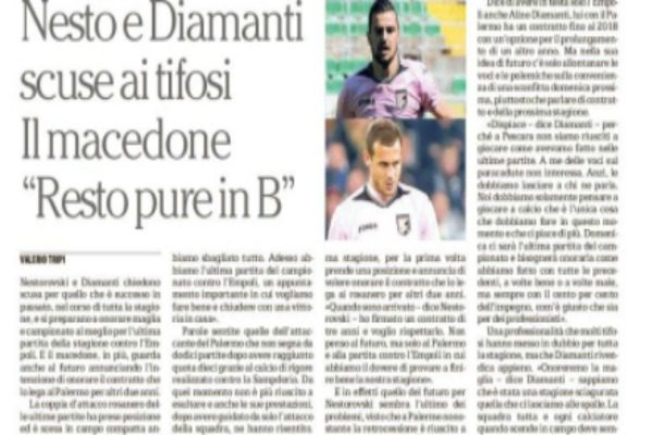 “Nestorovski e Diamanti chiedono scusa per quello che è successo in passato, nel corso di tutta la stagione, e si preparano a onorare maglia e campionato al meglio per l’ultima partita della stagione contro l’Empoli. E il macedone, in più, guarda anche al futuro annunciando l’intenzione di onorare il contratto che lo lega al Palermo per altri due anni. La coppia d’attacco rosanero delle ultime partite ha preso posizione ed è scesa in campo compatta anche nel post partita di Pescara, al termine dell’ennesima prova non solo incolore, ma anche deludente della stagione rosanero. «Voglio chiedere scusa da parte mia e per conto dei miei compagni – dice Ilija Nestorovski – in questa stagione abbiamo sbagliato tutto. Adesso abbiamo l’ultima partita del campionato contro l’Empoli, un appuntamento importante in cui vogliamo fare bene e chiudere con una vittoria in casa». Parole sentite quelle dell’attaccante del Palermo che non segna da dodici partite dopo avere raggiunto quota dieci grazie al calcio di rigore realizzato contro la Sampdoria. Da quel momento non è più riuscito a esultare e anche le sue prestazioni, dopo avere guidato da solo l’attacco della squadra, ne hanno risentito. Intorno al suo futuro si sono già scatenate le voci di mercato e le richieste da parte dei tifosi rosanero di rimanere a Palermo per guidare la riscossa della squadra in vista della lunga e impegnativa stagione di serie B. E lui, a proposito della prossima stagione, per la prima volta prende una posizione e annuncia di volere onorare il contratto che lo lega ai rosanero per altri due anni. «Quando sono arrivato – dice Nestorovski – ho firmato un contratto di tre anni e voglio rispettarlo. Non penso al futuro, ma solo al Palermo e alla partita contro l’Empoli in cui abbiamo il dovere di provare a finire bene la nostra stagione». E in effetti quello del futuro per Nestorovski sembra l’ultimo dei problemi, visto che a Palermo nonostante la retrocessione è riuscito a entrare nel cuore dei tifosi ed è anche un potenziale uomo mercato visto che lo stesso presidente Baccaglini ha detto di avere respinto al mittente una proposta da 20 milioni di euro dalla Cina per il cartellino del macedone. Dice di avere in testa solo l’Empoli anche Alino Diamanti, lui con il Palermo ha un contratto fino al 2018 con un’opzione per il prolungamento di un altro anno. Ma nella sua idea di futuro c’è solo allontanare le voci e le polemiche sulla convenienza di una sconfitta domenica prossima, piuttosto che parlare di contratto e della prossima stagione. «Dispiace – dice Diamanti – perché a Pescara non siamo riusciti a giocare come avevamo fatto nelle ultime partite. A me delle voci sul paracadute non interessa. Anzi, le dobbiamo lasciare a chi ne parla. Noi dobbiamo solamente pensare a giocare a calcio che è l’unica cosa che dobbiamo fare in questo momento e che ci piace di più. Domenica ci sarà l’ultima partita del campionato e bisognerà onorarla come abbiamo fatto con tutte le precedenti, a volte bene o a volte male, ma sempre con il cento per cento dell’impegno, com’è giusto che sia per dei professionisti». Una professionalità che molti tifosi hanno messo in dubbio per tutta la stagione, ma che Diamanti rivendica appieno. «Onoreremo la maglia – dice Diamanti – sappiamo che è stata una stagione sciagurata quella che ci lasciamo alle spalle. La squadra tutta e ogni calciatore quando scende in campo deve sempre dare tutto quello che ha. Le voci, le polemiche e tutte le altre chiacchiere le lasciamo a chi deve parlare. A noi non interessano e non vogliamo farci distrarre dall’impegno agonistico»”. Questo quanto riportato da “La Repubblica”.