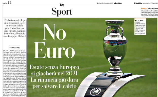 Repubblica: “No Euro Estate, senza Europeo si giocherà nel 2021. La rinuncia più dura per salvare il calcio”