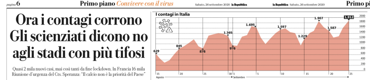 Repubblica: “Ora i contagi corrono. Gli scienziati dicono no agli stadi con più tifosi. Speranza: “Il calcio non è la priorità del Paese”