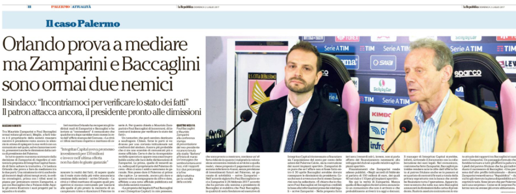 Repubblica: “Orlando prova a mediare, ma Zamparini e Baccaglini sono ormai due nemici. Il sindaco: “Incontriamoci per verificare lo stato dei fatti”. Il patron attacca ancora, il presidente pronto alle dimissioni”