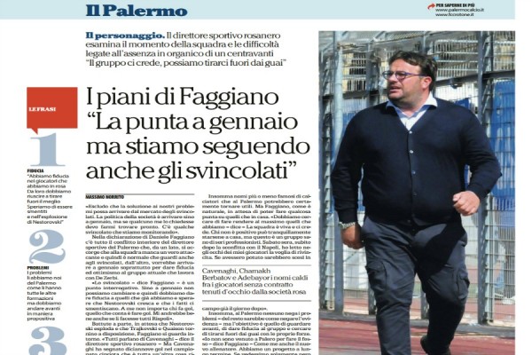 “«Escludo che la soluzione ai nostri problemi possa arrivare dal mercato degli svincolati. La politica della società è arrivare sino a gennaio, ma se qualcuno me lo chiedesse devo farmi trovare pronto. C’è qualche svincolato che stiamo monitorando». Nella dichiarazione di Daniele Faggiano c’è tutto il conflitto interiore del direttore sportivo del Palermo che, da un lato, si accorge che alla squadra manca un vero attaccante e quindi è normale che guardi anche agli svincolati, dall’altro, vorrebbe arrivare a gennaio soprattutto per dare fiducia ed ottimismo al gruppo attuale che lavora con De Zerbi. «Lo svincolato – dice Faggiano – è un punto interrogativo. Sino a gennaio non possiamo cambiare e quindi dobbiamo dare fiducia a quelli che già abbiamo e sperare che Nestorovski cresca e che i fatti ci smentiscano. A me non importa chi fa gol, quello che conta è fare gol. Mi andrebbe bene anche se li facesse tutti Rispoli». Battute a parte, in attesa che Nestorovski esploda e che Trajkovski e Quaison tornino a disposizione, Faggiano si guarda intorno. «Tutti parlano di Cavenaghi – dice il direttore sportivo rosanero – Ma Cavenaghi ha segnato diciannove gol nel campionato cipriota che è tutta un’altra cosa rispetto a quello italiano». Sì, proprio come quello croato dove Nestorovski ha segnato venticinque reti. Cavenaghi, dalla sua, avrebbe però la grande esperienza maturata in Argentina e in Europa, ma non è l’attaccante di Buenos Aires l’unico a essere monitorato da Faggiano. Un altro è Marouane Chamakh, ventottenne franco marocchino che lo scorso anno ha giocato con la maglia del Crystal Palace. E ancora, c’è Emmanuel Adebayor, togolese anche lui ventottenne, che lo scorso anno era pure lui nel Crystal Palace che però ha il problema di non essere comunitario. C’è poi Dimitar Berbatov, trentacinquenne bulgaro lo scorso anno al Paok Salonicco. Insomma nomi più o meno famosi di calciatori che al Palermo potrebbero certamente tornare utili. Ma Faggiano, come è naturale, in attesa di poter fare qualcosa punta su quelli che in casa. «Dobbiamo cercare di fare rendere al massimo quelli che abbiamo – dice – La squadra è viva e ci crede. Chi non è positivo può tranquillamente starsene a casa, ma questo è un gruppo sano di seri professionisti. Sabato sera, subito dopo la sconfitta con il Napoli, ho letto negli occhi dei miei giocatori la voglia di rivincita. Se avessero potuto sarebbero scesi in campo già il giorno dopo». Insomma, al Palermo nessuno nega i problemi – del resto sarebbe come negare l’evidenza – ma l’obiettivo è quello di guardare avanti, di dare fiducia al gruppo e cercare di tirarsi fuori dai guai con le proprie forze. «Io non sono venuto a Palermo per fare il fesso – dice Faggiano – Come me anche il nuovo allenatore. Abbiamo un progetto a lungo termine. Se vedessimo solamente nero il nostro lavoro sarebbe inutile. Io cerco di guardare sempre avanti. Se sono a Palermo è perché voglio migliorare: Giorno dopo giorno. Ci tengo a fare bene e non voglio fare cattive figure». I propositi sembrano essere buoni, ma nel calcio quello che contano sono i fatti. I fatti dicono che in tre giornate il Palermo ha un solo punto, ha segnato una sola rete con un tiro di un difensore deviato, ha subito cinque gol. E domenica c’è il Crotone una diretta rivale per non retrocedere. «Dopo tre giornate di campionato non si può certo parlare di ultima spiaggia, ma è una gara molto importante e noi ce la possiamo giocare con tutti»”. Questo quanto si legge sull’edizione odierna de “La Repubblica” in merito alle parole di Daniele Faggiano rilasciate ieri in conferenza.