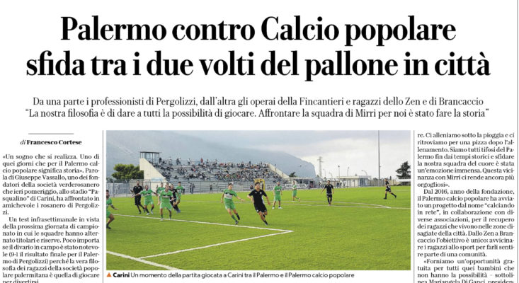 L’edizione odierna de “La Repubblica” si sofferma sulla sfida tra Palermo e Palermo Calcio Popolare. «Un sogno che si realizza. Uno di quei giorni che per il Palermo calcio popolare significa storia». Parola di Giuseppe Vassallo, uno dei fondatori della società verderosanero che ieri ha affrontato il club di Mirri. Il match è terminato sul risultato di 9-1 per gli uomini di Pergolizzi. Da una parte il nuovo Palermo degli imprenditori Dario Mirri e Tony Di Piazza, nato dalle ceneri delle società fallita la scorsa estate ed il cui valore della rosa è attualmente stimato intorno ai 2,6 milioni di euro. Dall’altra il Palermo del popolo che gioca ancora nei campi in terra battuta della periferia e senza alcuna struttura societaria alle spalle. Quasi tutti operai della Fincantieri: lavoratori durante la settimana, calciatori nel weekend. «Amiamo il Palermo, siamo tifosi e gestiamo una squadra con l’azionariato popolare – sottolinea Giuseppe Vassallo – Al centro del nostro progetto c’è la gente. Chiunque può diventare un socio fondatore». L’allenatore Giovanni Troia afferma: «La domenica scendiamo in campo con lo spirito di divertirci – dice Troia – Siamo “ popolari” e non ci sono le ricchezze dei campionati professionistici ma scendiamo in campo per vincere. Ci alleniamo sotto la pioggia e ci ritroviamo per una pizza dopo l’allenamento. Siamo tutti tifosi del Palermo fin dai tempi storici e sfidare la nostra squadra del cuore è stata un’emozione immensa. Questa vicinanza con Mirri ci rende ancora più orgogliosi». «Forniamo un’opportunità gratuita per tutti quei bambini che non hanno la possibilità – sottolinea Mariangela Di Ganci, presidente del laboratorio “Zen insieme”, associazione che collabora con il Palermo calcio popolare – Fare sport deve essere un diritto». Dai tornei dei centri aggregativi organizzati dal Palermo Calcio Popolare, è passato anche il giovane attaccante rosanero Raimondo Lucera.
