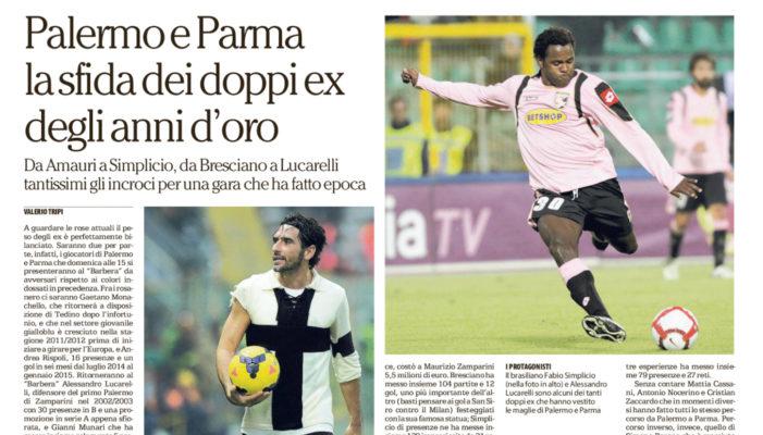 “A guardare le rose attuali il peso degli ex è perfettamente bilanciato. Saranno due per parte, infatti, i giocatori di Palermo e Parma che domenica alle 15 si presenteranno al “Barbera” da avversari rispetto ai colori indossati in precedenza. Fra i rosanero ci saranno Gaetano Monachello, che ritornerà a disposizione di Tedino dopo l’infortunio, e che nel settore giovanile gialloblu è cresciuto nella stagione 2011/2012 prima di iniziare a girare per l’Europa, e Andrea Rispoli, 16 presenze e un gol in sei mesi dal luglio 2014 al gennaio 2015. Ritorneranno al “Barbera” Alessandro Lucarelli, difensore del primo Palermo di Zamparini nel 2002/2003 con 30 presenze in B e una promozione in serie A appena sfiorata, e Gianni Munari che ha messo insieme solamente 5 presenze in totale in sei mesi di rosanero fra il luglio 2006 e in gennaio 2007, ma nessuna in campionato, visto che ha indossato la maglia del Palermo due volte in Coppa Italia e tre in Coppa Uefa.
