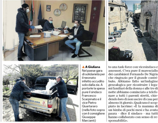 E’ lui che – la notte fra il 10 e l’ 11 marzo – ha ricevuto la telefonata dei vertici dell’ospedale di Corleone che ha comunicato il primo contagio nel paese. E’ una giovane di 30 anni che nei giorni scorsi si è recata al Pronto soccorso di Corleone per una radiografia al torace. La febbre era ormai passata, ma lei continuava a non sentirsi bene. Così il medico le ha consigliato di andare in ospedale. Lo stesso ospedale dove era stato ricoverato qualche giorno prima il piccolo Giulio per una bronchiolite. Adesso il reparto di Pediatria e il Punto nascite sono chiusi perché i 4 pediatri che hanno visitato il bimbo sono in quarantena e anche la metà dei sanitari del Pronto soccorso è in isolamento per i contatti avuti con la madre. «Nottetempo – racconta il primo cittadino – è arrivata un’ambulanza e ha portato via la madre, che si trova ricoverata in Malattie infettive al Civico di Palermo. Ho riunito subito una task-force con vicesindaco e assessori. C’era pure il maresciallo dei carabinieri Fernando De Nigris che ringrazio per il grande contributo. Abbiamo fatto un’indagine genealogica per ricostruire i legami familiari della donna e alle tre di notte abbiamo cominciato a telefonare a tutti i parenti stretti, chiedendo loro di non uscire di casa per almeno 14 giorni». Qualcuno è scoppiato in lacrime: « È la mamma di un bimbo di pochi mesi e ha avuto paura – dice il sindaco – ma tutti hanno collaborato con senso di responsabilità». Anche il padre – un trentenne del paese che si arrangia con piccoli lavoretti in campagna – è in quarantena. E il piccolo, che al momento sta bene e non ha sintomi, è stato affidato alle cure di una zia materna di 51 anni: «Pur essendo risultata negativa al tampone – racconta il sindaco – ha deciso di accudire il figlio della nipote. Ha mandato via il marito e i due figli, che si trovano nella casa di villeggiatura, e ogni giorno si occupa del neonato. Gli cambia il pannolino, gli dà il latte, gli canta la ninna- nanna, in attesa del rientro della madre » . Proprio ieri mattina il sindaco è andato personalmente a casa sua per portarle nuovi guanti e mascherine con filtro, il latte artificiale e i vestiti da neonato rimasti nella casa materna: «Abbiamo lasciato i sacchetti dietro la porta e abbiamo scambiato due parole con lei per incoraggiarla». Nella sua stanza, dentro un palazzo comunale deserto, ogni giorno il primo cittadino pianifica le tappe del giorno per dare assistenza a chi è in quarantena, insieme al suo braccio destro, il vicesindaco Pietro Quartararo, e al presidente del Consiglio comunale Giuseppe Marcianti. «Abbiamo appena portato la legna al papà del neonato – racconta – perché in pochissimi in paese hanno impianti di riscaldamento a gas. Adesso passeremo a casa della sorella della donna, anche lei risultata positiva». Oltre ai tre contagiati, ci sono a Giuliana altre 70 persone in quarantena, preventiva o obbligatoria: « Sono i parenti della donna – racconta il vicesindaco Quartararo– e le famiglie di persone rientrate dal Nord. È nostro dovere assisterli. E tutti stanno dando un contributo». C’è il proprietario della bottega che ogni giorno porta a casa degli “ isolati” latte, pasta e generi di prima necessità. Il farmacista che impacchetta tachipirina e farmaci salvavita per darli ai volontari che li distribuiscono a domicilio. Ci sono cittadini che portano la spesa e persino le sigarette a chi non può uscire di casa. C’è soprattutto un intero paese che si è riscoperto solidale, ai tempi del coronavirus – conclude il quotidiano -.