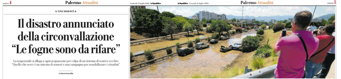 L’edizione odierna di “Repubblica” parla del nubifragio di mercoledì’ a Palermo. Zeila Tesoriere, docente di Progettazione architettonica, sulla riqualificazione della circonvallazione ha presentato al Comune un progetto quasi a costo zero già cinque anni fa. Goffredo La Loggia, professore di Sistemi Idraulici urbani ex direttore del Dipartimento di Ingegneria, ha detto: « Considerata l’espansione della città, che inghiottendo i giardini e costruendoci sopra ha impermeabilizzato i terreni, si dovrebbe realizzare un nuovo canale di gronda come quelli Boccadifalco e Passo di Rigano: ma intanto non ci sarebbero gli spazi e poi l’idea di avviare un’opera pubblica mette paura».