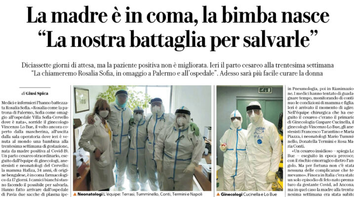 L’edizione odierna di “Repubblica” si è soffermata sulla situazione di una donna di Palermo che, in coma, ha partorito la sua bambina nata da madre positiva al Coronavirus, con i medici e infermieri che l’hanno battezzata Rosalia Sofia: «Rosalia come la patrona di Palermo, Sofia come omaggio all’ospedale Villa Sofia- Cervello dove è nata» , afferma il ginecologo Vincenzo Lo Bue.