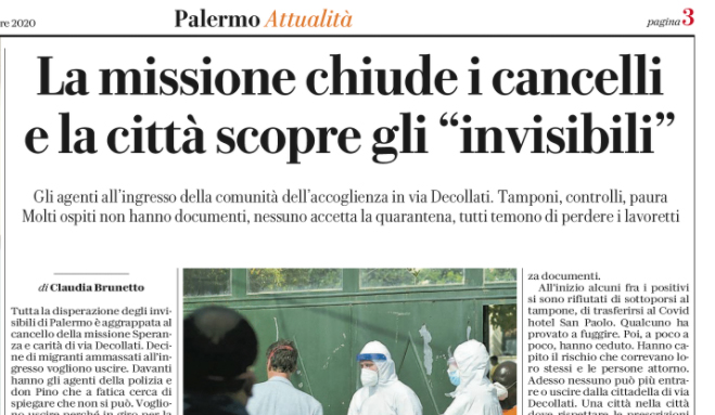 Repubblica: “Palermo. La missione chiude i cancelli e la città scopre gli “invisibili”